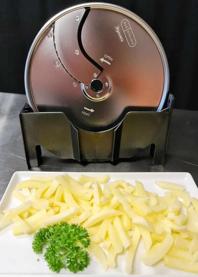Die ideale Scheibe für Pommes Frites, Ofengemüse oder rustikale Gemüse-Sticks. Produziert kräftige Streifen mit viel Volumen – perfekt für Kartoffeln, Pastinaken, Karotten oder Kürbis. In Großküchen und Imbissen besonders beliebt für vorgeschnittene Garprozesse.