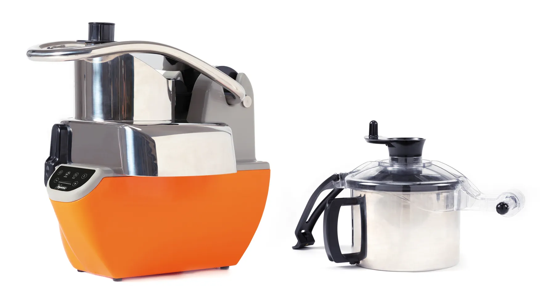 DIE IDEALE ALTERNATIVE ZUM SCHNEIDEN, ZERKLEINERN, VERMENGEN UND EMULGIEREN VON ZUTATEN IN DER PROFESSIONELLEN KÜCHE. Der ergonomisch geformte Griff des Gemüseschneiders bietet sowohl Linkshändern als auch Rechtshändern eine einfache Handhabung. UNSER QUALITÄTSVERSPRECHEN: Performance: Scheiben mit dem breitesten Durchmesser auf dem Markt. Komfort: Leiser Motor (50 dB) ohne Vibrationen. Ergonomie: Geeignet für Rechts- und Linkshänder. Hygiene: Alle Zubehörteile sind spülmaschinenfest.