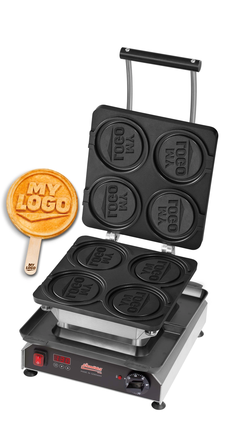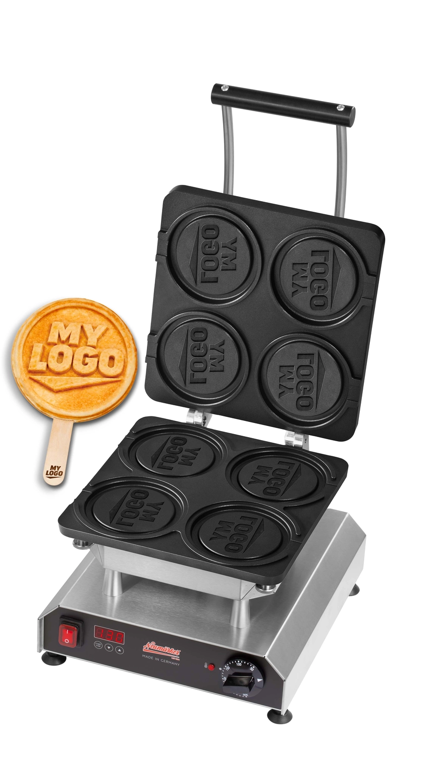 - Technische Details: Backplatte für 4 Waffeln am Stiel à Ø 120 x h 18 mm. Passend für Thermocook (nicht geeignet für Thermocook Twin). Wir benötigen Ihr Logo als hochauflösende Grafik, idealerweise als Vektordatei. Das Logo sollte zweifarbig sein, da auf der Waffel nur zwei Ebenen darstellbar sind. Die Grundform der Waffel ist vorgegeben, die Logo-Fläche hat einen Durchmesser von 100 mm. Eine originalgetreue Umsetzung ist nicht immer möglich; Anpassungen oder Vereinfachungen erfolgen in Abstimmung mit Ihnen. Alternativ kann auch ein Schriftzug mit ca. 10 Zeichen (abhängig von Text und Schriftart) umgesetzt werden.