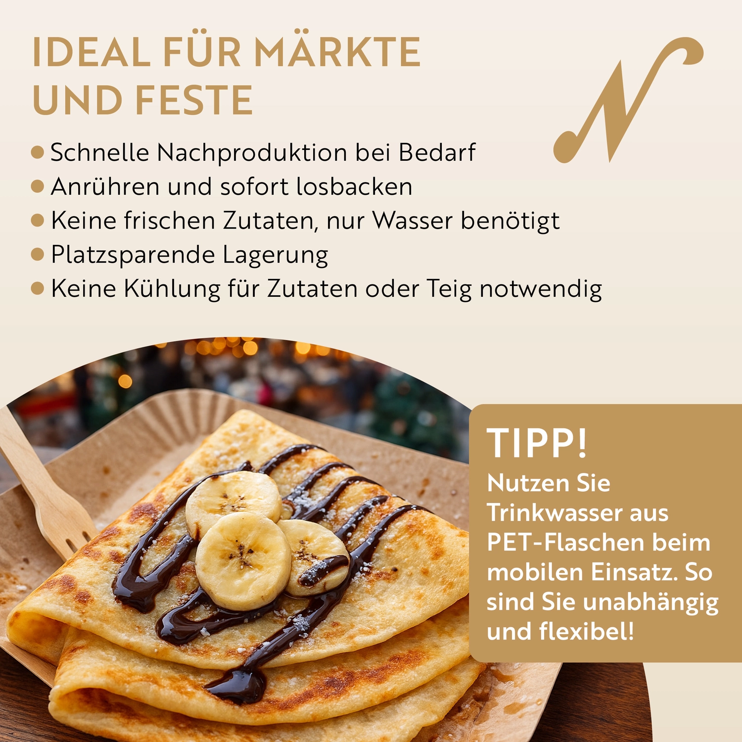 - Die ideale Crêpes-Backmischung für Märkte und Feste: Schnelle Nachproduktion bei Bedarf. Anrühren und sofort losbacken. Keine frischen Zutaten, nur Wasser benötigt. Platzsparende Lagerung. Keine Kühlung für Zutaten oder Teig notwendig.